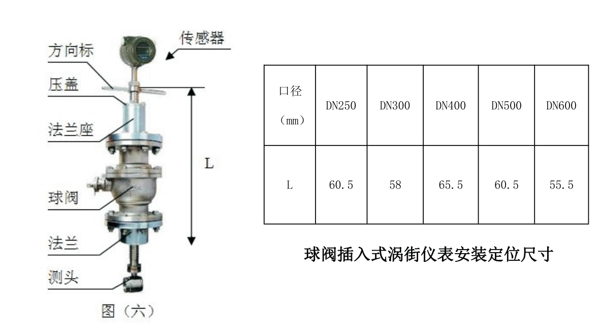 2.3將DN50球閥安裝到安裝底座上。注意球閥的長空腔向上,檢査球閥是否能全開全關。如有問題應進行修理將壓緊螺紋座、壓緊螺母和橡膠密封圈安裝 到球閥上。松開定位螺釘和壓緊螺母,將傳感器插入桿通過球閥插入被測管道。插入 深度由H4計算,并由游標卡尺或鋼卷尺測量,符合要求后,上緊壓緊螺母和定位螺 釘,同時應注意傳感器方向標志桿指向應和流體流向一致